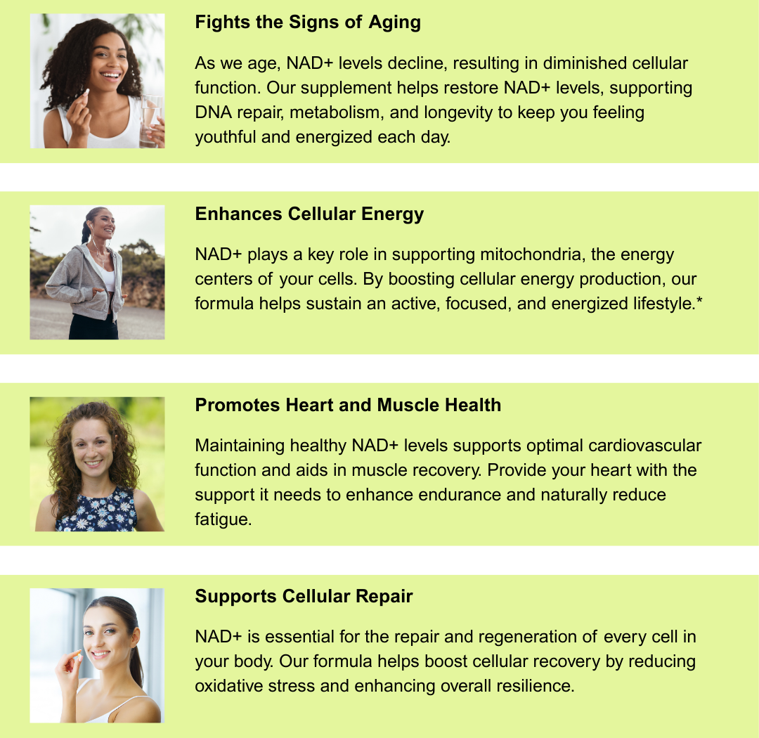 "Love this product! Not only does it give me a noticeable energy boost, but my skin looks so much healthier and radiant. I’m feeling younger and more vibrant every day. This NAD+ supplement is now a must-have in my daily routine!"