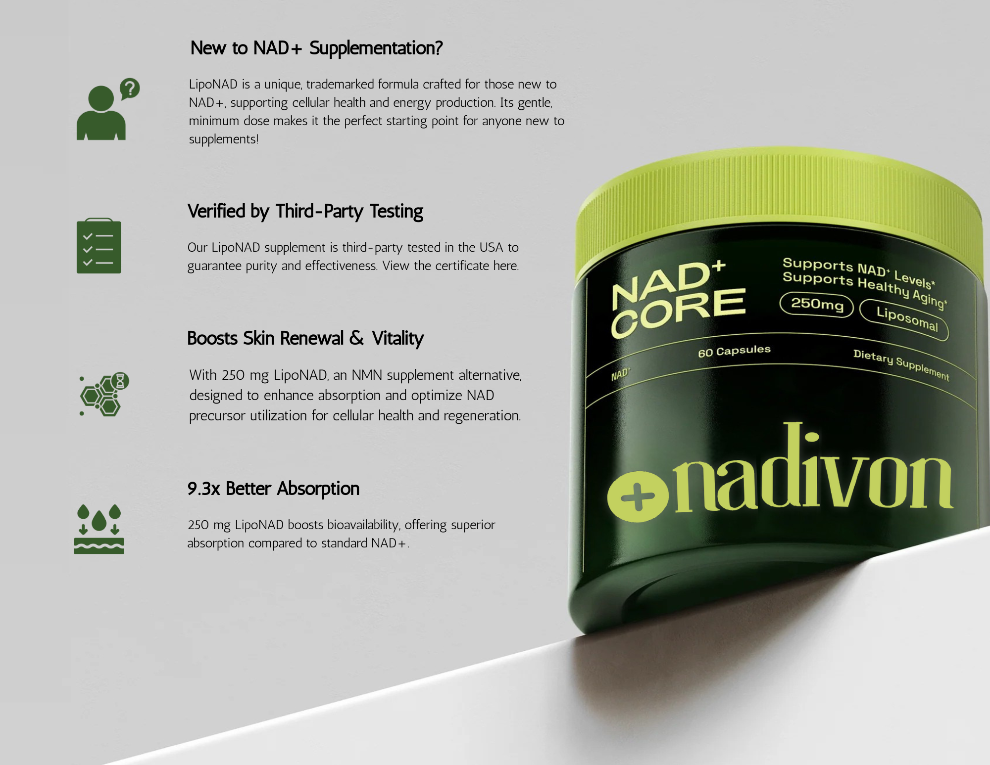 - Take Nadivon daily to elevate your NAD+ baseline and achieve optimal results.